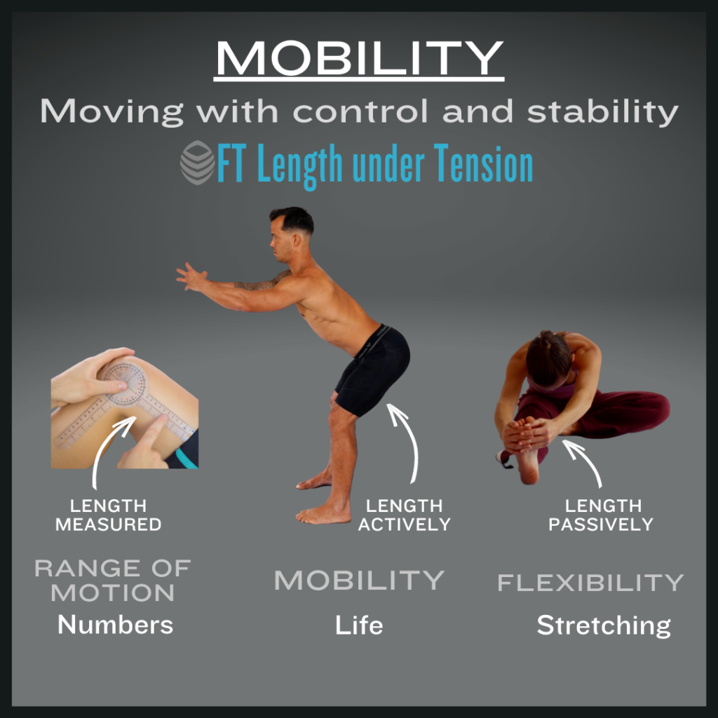 Flexibility is the range that a muscle can be passively lengthened. Passive = muscle that is not loaded, controlled, or necessarily stable. Mobility, on the other hand, is the range of motion a joint can move actively. Active = muscle that is loaded, controlled, and stable.